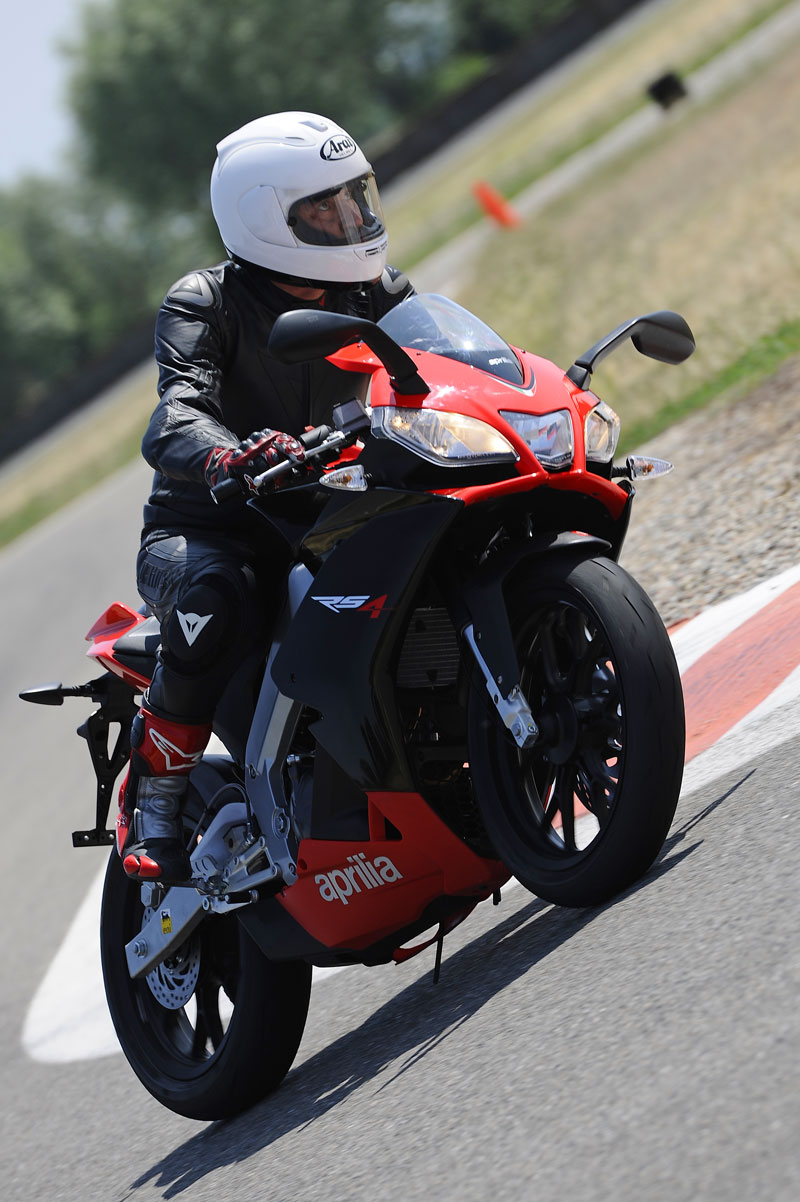 Aprilia ha sido una de las últimas en adaptarse a las medidas “ecológicas” que Europa está exigiendo a las motos de cuarto de litro, y no por falta de la tecnología necesaria, las GPR de Derbi ya montan desde el año pasado motores cuatro tiempos y son del mismo grupo empresarial al que pertenece Aprilia, sino por algo que va más allá de los simples números y de la disponibilidad de tecnología… su tradición deportiva. Como nos comentaba Maura Paccagnella (Aprilia Product Manager) en el briefing previo a esta prueba, Aprilia siempre ha aplicado la experiencia adquirida en los circuitos sobre sus motos de calle y sobretodo en sus RS, que son consideradas como su “Escuela de Campeones”, por esto, ya desde las AF1-125 “Réplica” de finales de los ochenta, hemos visto desfilar por sus concesionarios un sinfín de motos que emulaban los éxitos cosechados en las pistas por la marca transalpina. Quizás por esta razón desde Noale han querido aprovechar la consecución del mundial de Superbikes del 2010, para jubilar sus “RS” de 2 tiempos y presentar esta réplica a escala de la moto vencedora en manos de Max Biaggi del mundial de 4 tiempos por antonomasia.