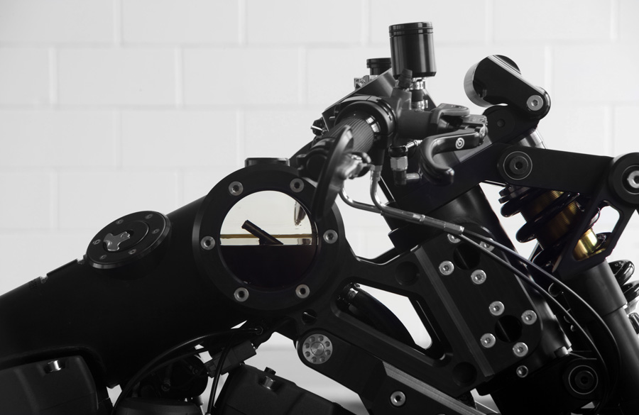 En cuanto a la moto, que solo pesa 210kg, destaca por encima de todo su chasis, éste es una gran viga central de corte circular y unas pletinas laterales, todo construido en el mejor aluminio 6061, destinado normalmente a la aviónica, que alberga además el combustible y el aceite. Del mismo material es su basculante y su extraña horquilla, que le da buena parte de su personalidad. El motor, como no podía ser de otra manera, es un bicilíndrico a 45º, que cubíca 1.996cc y entrega 160cv muy abajo. Estas prestaciones, han obligado a estos sureños a esmerarse en la parte ciclo para mantenerla pegada al suelo, para ello se han utilizado unos neumáticos Pirelli de medidas 120/19 y 240/18 y unos amortiguadores firmados por Race Tech que cumplen a la perfección.