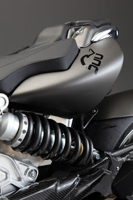 Como ya hemos mencionado, una de las características más notables de esta moto es la utilización de la viga central del chasis, tipo “Backbone”, como depósito de gasolina, éste tiene una sección de 107,5 mm y está unido a los otros elementos del bastidor, elaborados también en acero inoxidable, mediante soldaduras artesanales con TIG. El subchasis, que está fabricado en aleación ligera, también cumple la función de contenedor de parte de la gasolina, además de albergar la bomba de ésta, la batería, la ECU y otros componentes eléctricos. Este subchasis variará según optemos por la versión monoposto, llamada “Deperlù” o la opción biposto, “Conlatusa”, en ambos casos es de las partes más bonitas de la moto junto con el imponente basculante monobrazo, hecho de un solo tubo de acero inoxidable de 90 mm de sección y reforzado con una estructura del mismo material soldada.