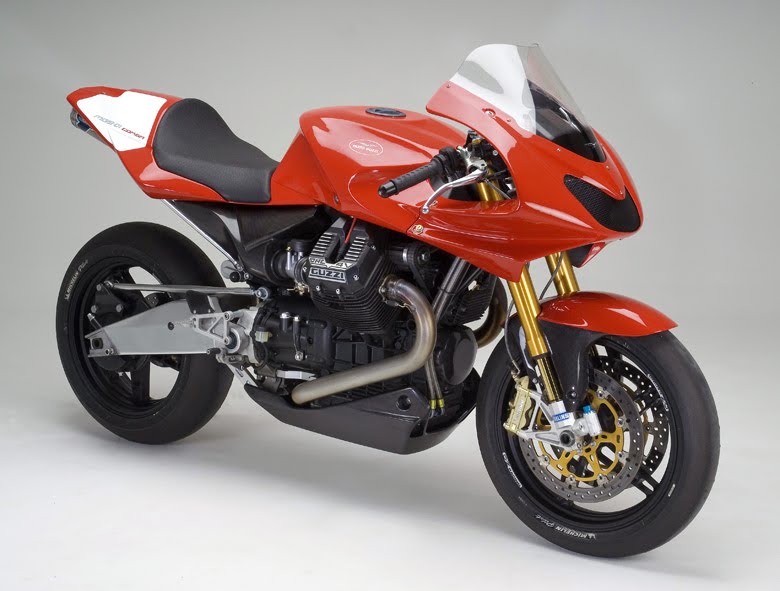 Hace casi una década que vimos por primera vez esta preciosidad en el Intermot. Acompañada de otro prototipo, la Griso, corrió peor suerte que ésta y quedo solo en una moto para uso exclusivo en pista, dejando a más de un devoto de la marca con un par de palmos de narices. Por otro lado, esta decisión, ha permitido disfrutar a unos pocos de algunas exquisiteces que en una producción para calle deberían haber sido sustituidas por otras menos “nobles”.