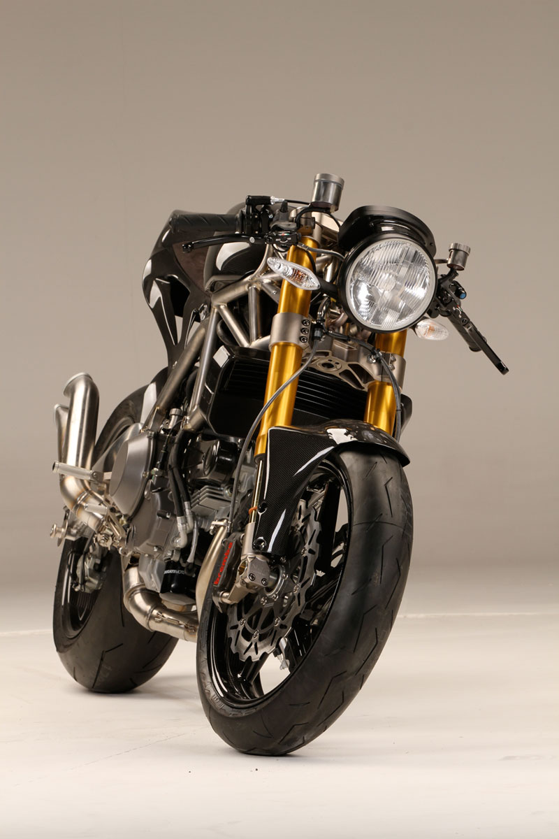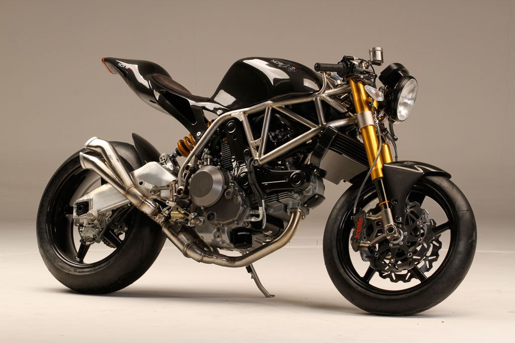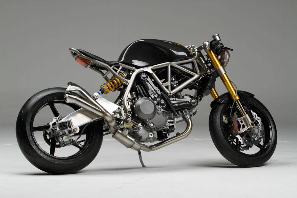 Pero para NCR no ha sido suficiente, y gracias ello tenemos la M4, que no es otra cosa que una evolución matriculable de la Millona, obviando carenados y otros ornamentos. El concepto es bastante sencillo: cogemos el chasis de la Millona, lo fabricamos en titanio (has leído bien, en titanio) y metemos el último motor de 2 válvulas por cilindro desarrollado por Ducati, el 1.100 EVO, con ciertos retoques por supuesto. El resultado, un juguete de 107cv de potencia y tan solo 130Kg de peso en la versión estándar. ¿Impresiona? Pues aún hay más, en la fabrica de sueños para “nenes” grandes que es NCR se han propuesto que la M4 sea una de las primeras motos modulables del mercado, y te preguntarás que significa “modulable”, pues simplemente que tu M4 de calle tras desconectarla un par de cables y quitar y poner una decena de tornillos se convierte en una moto de circuito con semicarenado y colín de carreras. Esta puede ser una buena razón, junto a las sensaciones que nos promete su relación peso/potencia, para auto-convencerte de pagar los algo más de 40.000€ que costará en Europa. Sin duda una cifra muy elevada, que no podría entenderse sin detenernos un momento en sus componentes, parte ciclo y preparación motor.
