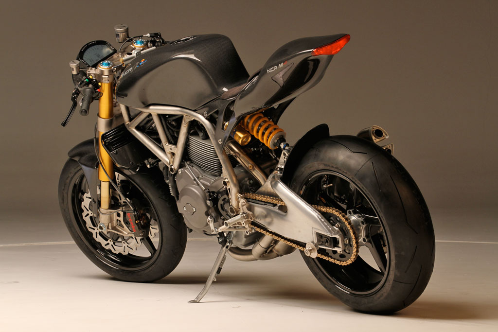 Presentada durante el World Ducati Weekend del pasado 2010, la NCR M16 es sin duda su producto estrella. Para su creación NCR se olvidaba de los motores de 2 válvulas por cilindro y se decantaba por el más radical de todos los propulsores del catálogo de Ducati, el D16RR, el mismo que monta la Desmosedici de calle. También desechaban su amado chasis multitubular para incluir uno tipo monocasco en fibra de carbono, como el que no le gusta a Rossi, e incluían todo su arsenal de piezas de titanio, aluminio y el ya mencionado carbono, para conseguir dejar su peso por debajo del de una MotoGp, solo 145Kg en su versión matriculable. Esto, unido a los más de 200cv a la rueda que entrega y a una buena cantidad de electrónica proveniente de MotoGp, como el control de tracción, tres mapas de gestión ajustables en marcha, la posibilidad de obtener datos telemétricos de la suspensión, embrague anti-rebote, etc. la convertía en una de las motos más exclusivas y potentes jamás fabricadas, con una relación peso/potencia de escándalo.